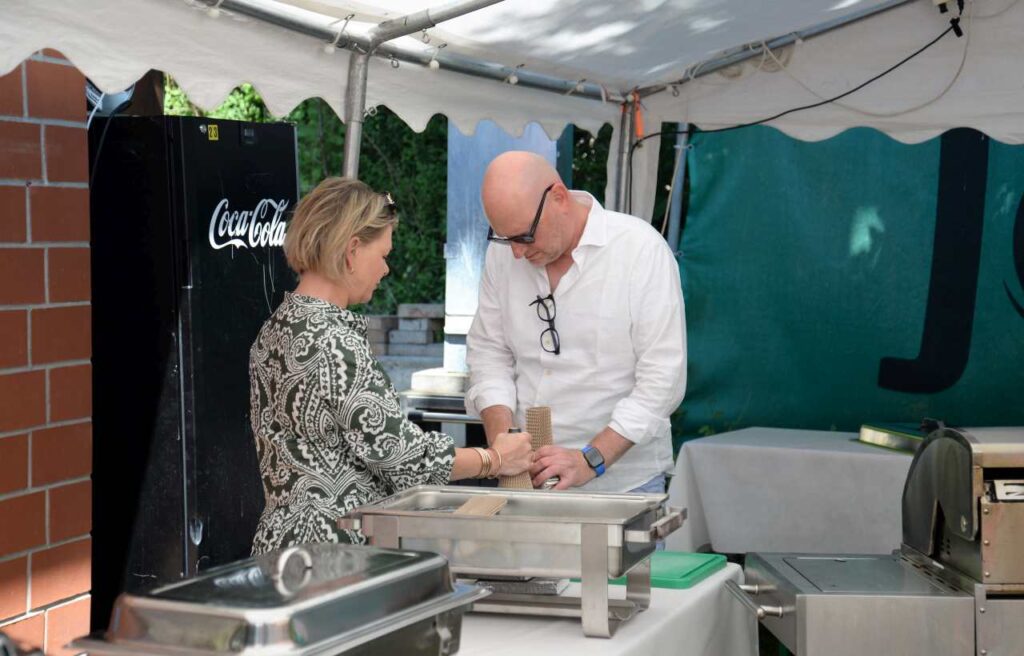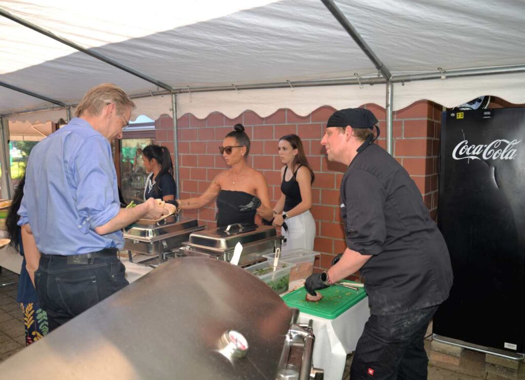 Mit Abschluss des Kinderprogramms um 18 Uhr begann der nun zweite, auch von Alt Zouftmeister Fredi Löhrer spendierte, Apéro und es fanden sich weitere Gäste ein. In den launigen Begrüssungsworten bedankte sich Zouftmeister Dr. Beat Ehrensberger bei allen Gästen, den Organisatoren – besonders auch Stubenmeister Nicolas Fürer – sowie namentlich nochmals Asuka und Dominique, seiner Gattin Stephi (welche auch noch Käse-Sommelière sei), dem für die kulinarischen Köstlichkeiten verantwortlichen Koch Wolfi mit seinem Team, Alt Zouftmeister Fredi Löhrer, Heinz Weyermann und Christoph Corrodi sowie Rolf Münger und Peter Rose. Seine eigene Geschichte vom ehemals obligatorischen Quartierrundgang mit durchtretenen Ledersohlen, verschwitztem Hemd und epischer Rundgangs-Länge, liess einen Schmunzeln. Das feine Grilladen Buffet mit Salat und Broten wurde sodann eröffnet.